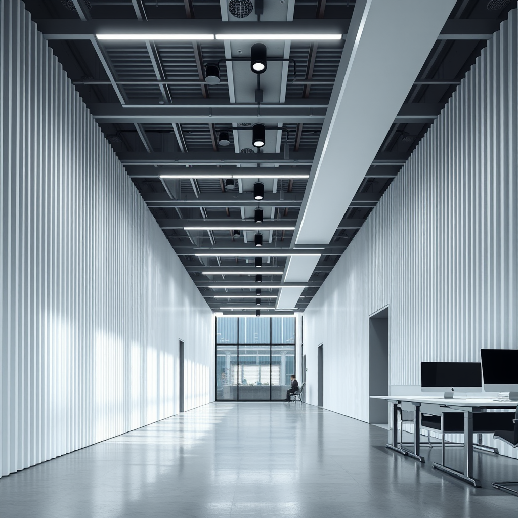 Photorealistic perspective view of a minimalist co-working space with a bright and ambient finish, showcasing an elaborate play of vertical and horizontal elements. The interior features minimalistic lighting with 4500K indirect illumination and sleek spotlights integrated into the ceiling. Designed to capture the essence of professional interior architecture in a raw style, the space embraces clean lines and open layouts, enhancing the sense of modernity and sophistication.