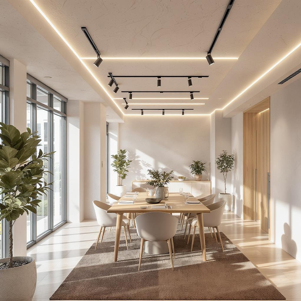 Photorealistic perspective view of a minimalist co-working space with bright finishes and ambient atmosphere; featuring an elaborate horizontal-vertical design aesthetic, minimalistic lighting with 4500K indirect light and sleek spotlights on the ceiling, showcasing professional interior architecture; create a serene and productive environment with clean lines and open spaces, balancing functionality and style in a harmonious blend of modern design elements, capturing subtle textures and natural materials that enhance the workspace's aesthetic appeal.