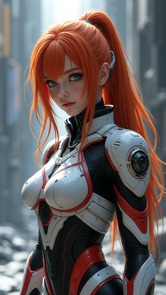 View this AI-generated image featuring photorealistic portrait of a stunning asuka langley in futuristic sci fi armor highly detailed and intricately designed set in a dynamic 16 9 composition with high clarity and vibrant colors capturing the essence of strength and beauty amidst a futuristic backd