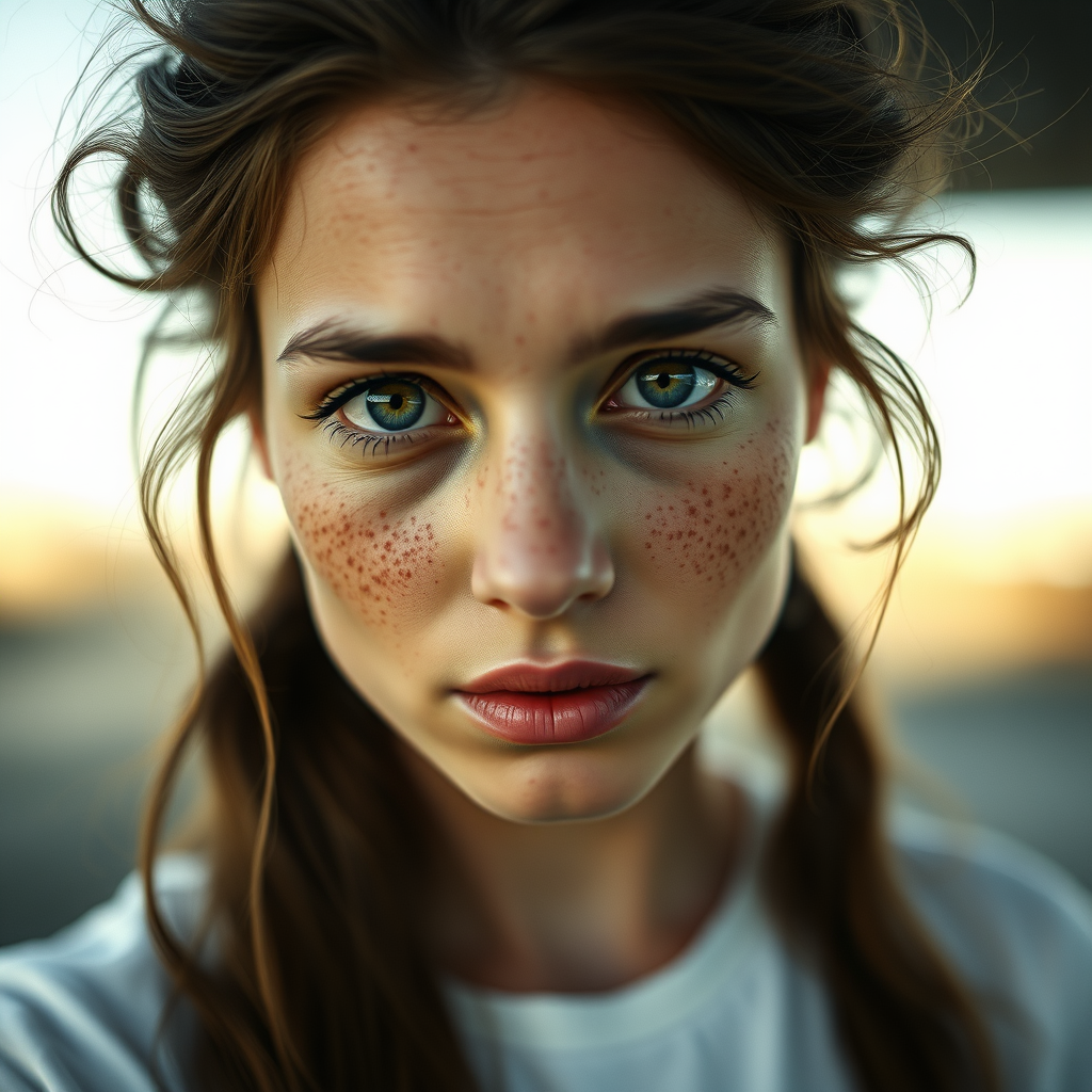 Photorealistic portrait of a freckled woman with expressive round eyes and tousled hair, captured outdoors in a simple white t-shirt. Her skin texture is highlighted, showing natural imperfections and chapped lips, in soft, natural lighting. Shot with an 85mm lens for a magical, dramatic effect. The image uses Cinestill 800T film for a moody yet realistic feel, with ultra-detailed, cinematic photography capturing the essence of a serene moment. Subtle shifts in lighting create a sense of depth and intimacy, blending the ordinary with an element of whimsical allure.