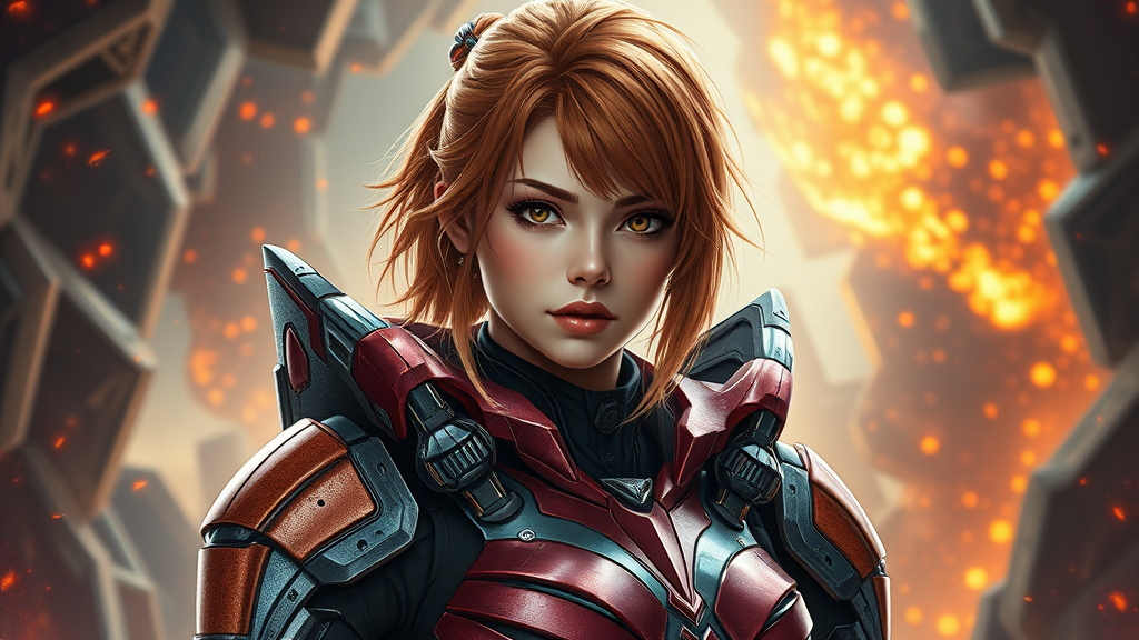 Photorealistic portrait of a stunning Asuka Langley, adorned in intricate futuristic sci-fi armor, capturing the blend of delicate beauty and strength, set against a dynamic and detailed background that complements her commanding presence, emphasizing vivid colors and realistic textures.