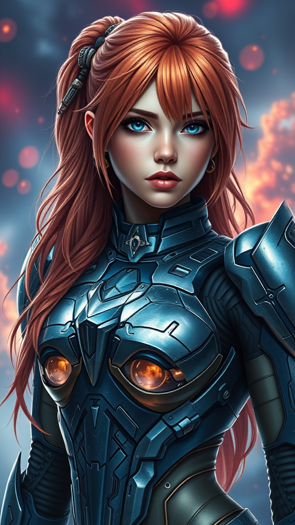 Photorealistic portrait of a stunning Asuka Langley dressed in intricate sci-fi armor, showcasing her fierce determination and intelligent gaze, a vivid and dynamic background accentuating her adventurous spirit, the details of the armor meticulously crafted to reflect a blend of futuristic technology and elegance, with subtle highlights and shadows enhancing the realism and depth of the image.