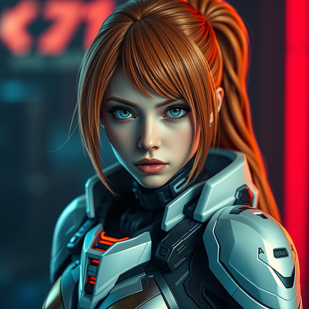 Photorealistic portrait of a stunning Asuka Langley clad in sleek sci-fi armor, capturing intricate details of her expression and futuristic attire, showcasing a vibrant fusion of technology and style, with an emphasis on vivid realism and dynamic composition, maintaining a tall 1:2 aspect ratio.