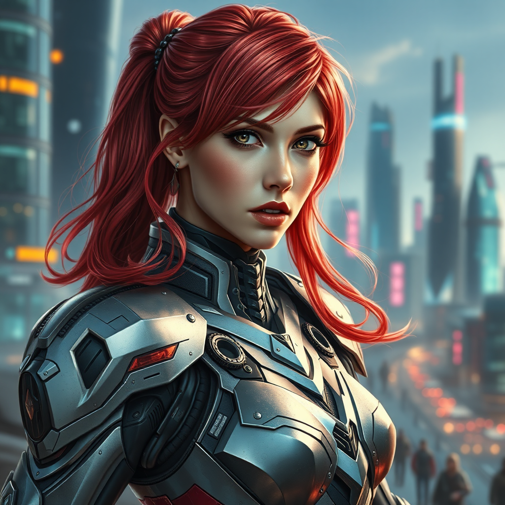 Photorealistic portrait of a stunning Asuka Langley dressed in intricate sci-fi armor, her red hair glinting with metallic hues, intricate details on the armor showcasing technological advancements, set against a dynamic futuristic cityscape, vibrant colors highlighting the contrast between her fierce expression and the calmness of the background.