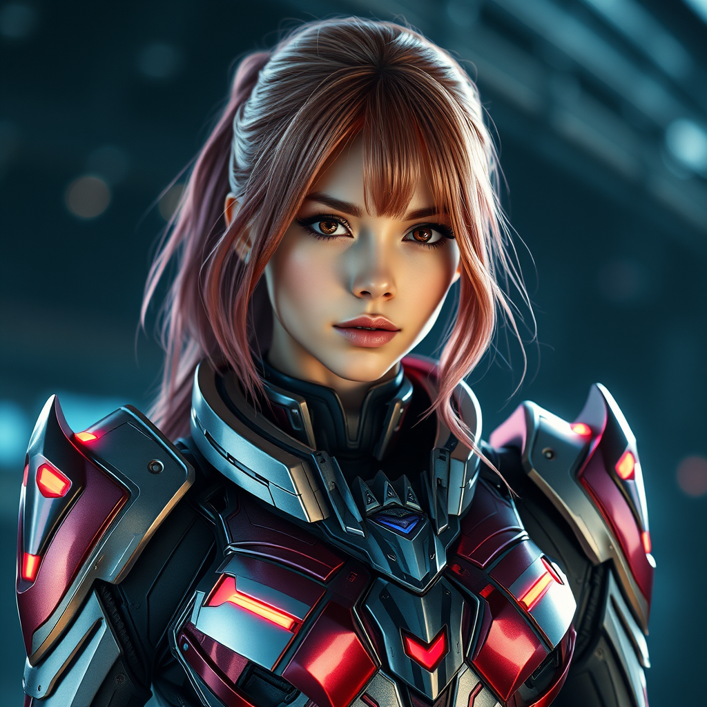 Photorealistic portrait of stunning Asuka Langley adorned in sleek, futuristic sci-fi armor, intricate details of the armor gleaming under ambient light, vivid colors highlighting her vibrant personality, soft yet determined expression on her face, set against a dramatic backdrop, capturing the essence of strength and elegance, ratio 1:2, high quality, enhanced clarity, dynamic composition.