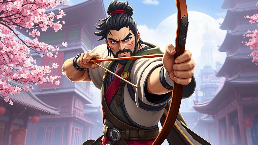 Photorealistic portrayal of Hanzo from Overwatch, depicted standing in a poised archery stance, showcasing an intense expression with key light emphasizing his facial features and traditional outfit. The scene captures a futuristic, culturally rich environment with elements of Japanese architecture, cityscapes, and cherry blossoms, reflecting the game's ambiance. The medium-wide shot draws inspiration from Anime, Cartoon, Manga, CGI, Video Game art, and Painting styles, incorporating subtle creative modifications to enhance the visual narrative.