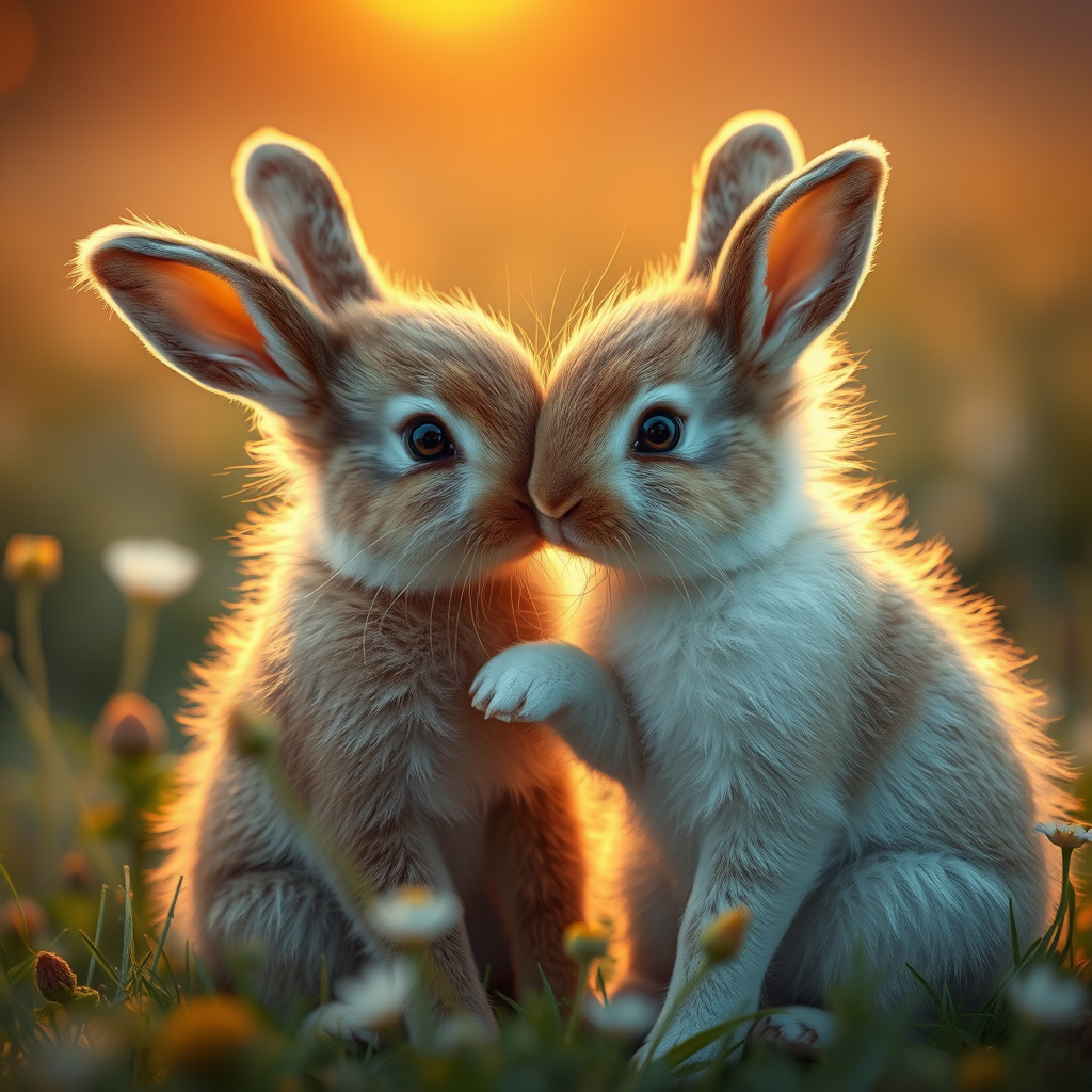 Photorealistic scene featuring two baby rabbits gently nuzzling each other, illuminated by soft, cinematic lighting. One rabbit is a warm light brown with a subtle, textured fur coat, while the other is a pristine white with a delicate, fluffy appearance. The background is a dreamy meadow with hints of wildflowers, bathed in the golden glow of a setting sun, adding a whimsical and tender atmosphere to the touching moment.