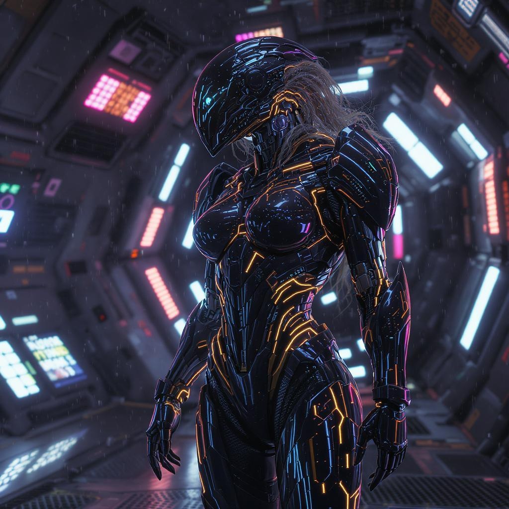 View this AI-generated image featuring a hyperrealistic photorealistic scene of an ultra detailed female space ranger clad in intricate cybernetic armor standing on a bustling space station adorned with radiant neon lights casting vibrant reflections the armor showcases cutting edge technology with