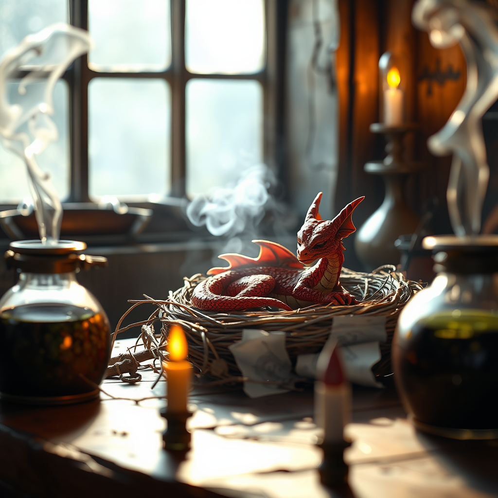 Photorealistic scene of a diminutive crimson dragon nestled asleep in a cozy nest, observed through a macro lens at f/2.8 on a medieval alchemist's table. The soft morning light streams through an adjacent window, casting ethereal steam shapes rising from bubbling potions. This 16K, 8K image exudes warmth and tranquility, capturing the essence of a medieval DND RPG setting, emphasizing comfort and enchantment in a high-resolution 3D fantasy world.