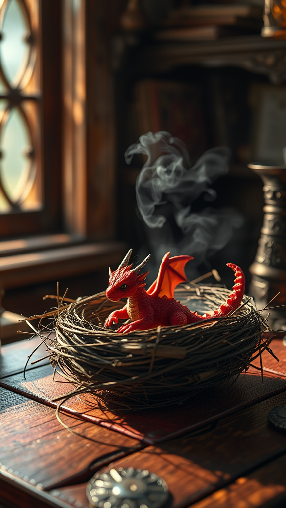 Photorealistic scene of a miniature crimson dragon nestled snugly within a nest on an ancient wizard's table, captured using a macro lens at f/2.8. The warm morning light spills through a nearby window, casting soft shadows and illuminating the vibrant colors of the scene. Wisps of steam rise gently, forming ethereal shapes in the air, enhancing the cozy atmosphere. The setting is richly detailed with medieval fantasy elements, reminiscent of DnD and RPG worlds, rendered in stunning 3D and captured in ultra-high resolution 16K and 8K.