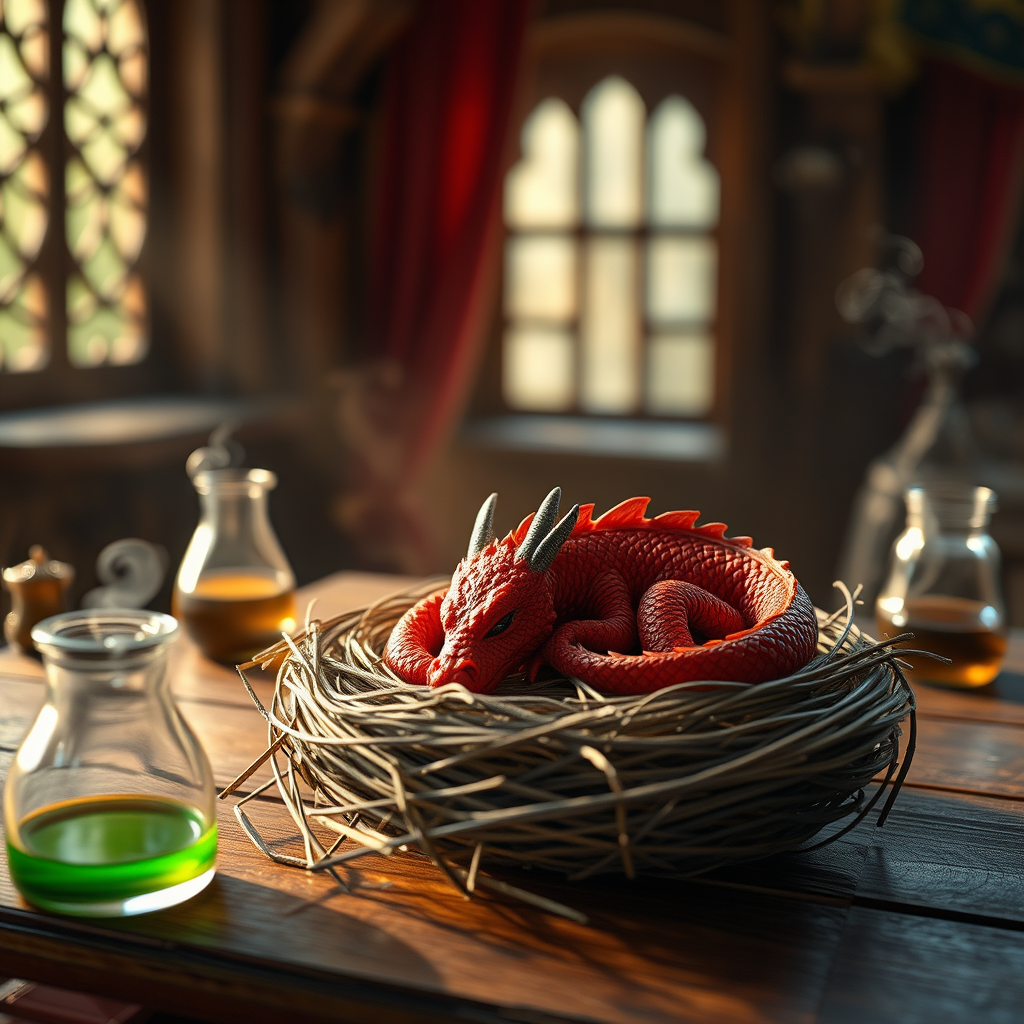 Photorealistic scene of a small red dragon peacefully curled up asleep in a nest on a medieval wizard's table, captured with a macro lens at f/2.8. Morning light softly filters through a nearby window, casting warm hues across the table and highlighting the dragon's shimmering scales. Delicate steam rises from a nearby potion, forming whimsical shapes in the air. The setting blends the charm of medieval D&D and RPG elements, rendered in stunning 3D detail at 16K, with an emphasis on warmth and comfort.