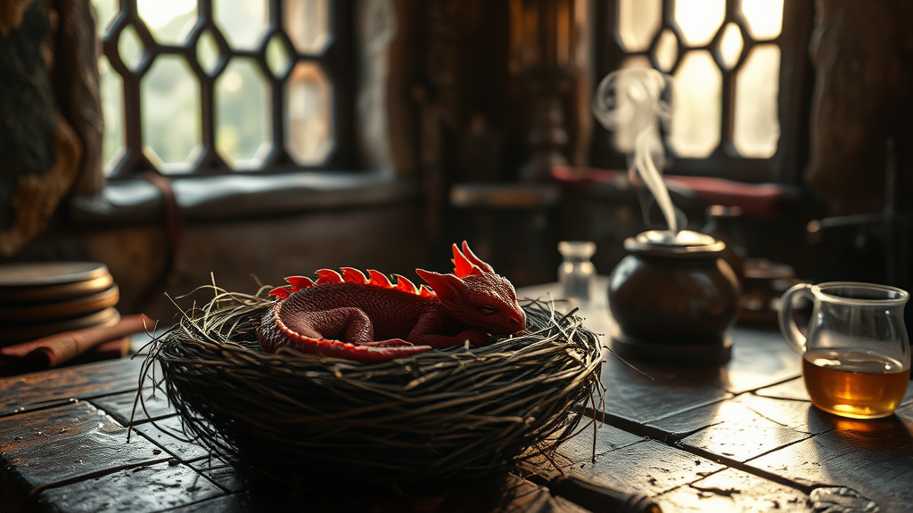 Photorealistic scene of a small ruby dragon nestled asleep in a nest on an ancient wizard's table, shot with a macro lens at f/2.8. Morning sunlight streams through a nearby window, casting soft hues and illuminating delicate steam swirls from a bubbling potion. The medieval setting is rich with textured details, evoking comfort and a magical atmosphere reminiscent of LOTR, DnD, and RPG themes, captured in stunning 16K and 8K for a truly immersive experience.