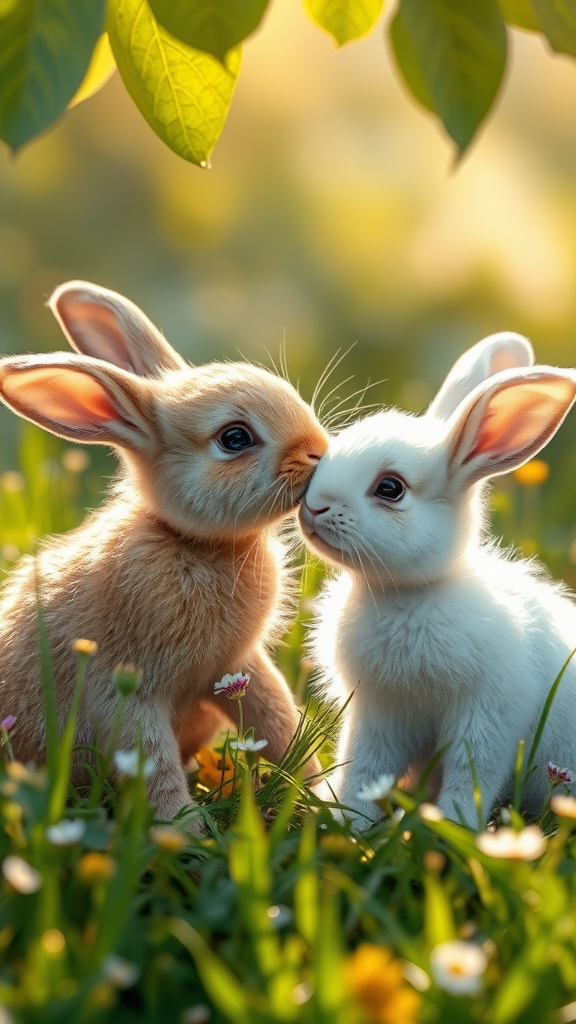 Photorealistic scene of two baby rabbits in a tender moment, nestled in a sun-dappled meadow with soft, cinematic lighting. The light brown rabbit leans gently toward its companion, a pure white bunny, their noses almost touching in a delicate kiss. Surrounded by a scattering of wildflowers and lush green grass, the scene captures the innocence and beauty of nature with exquisite detail, as the sunlight filters through the leaves above, casting a warm, golden hue on their fur.