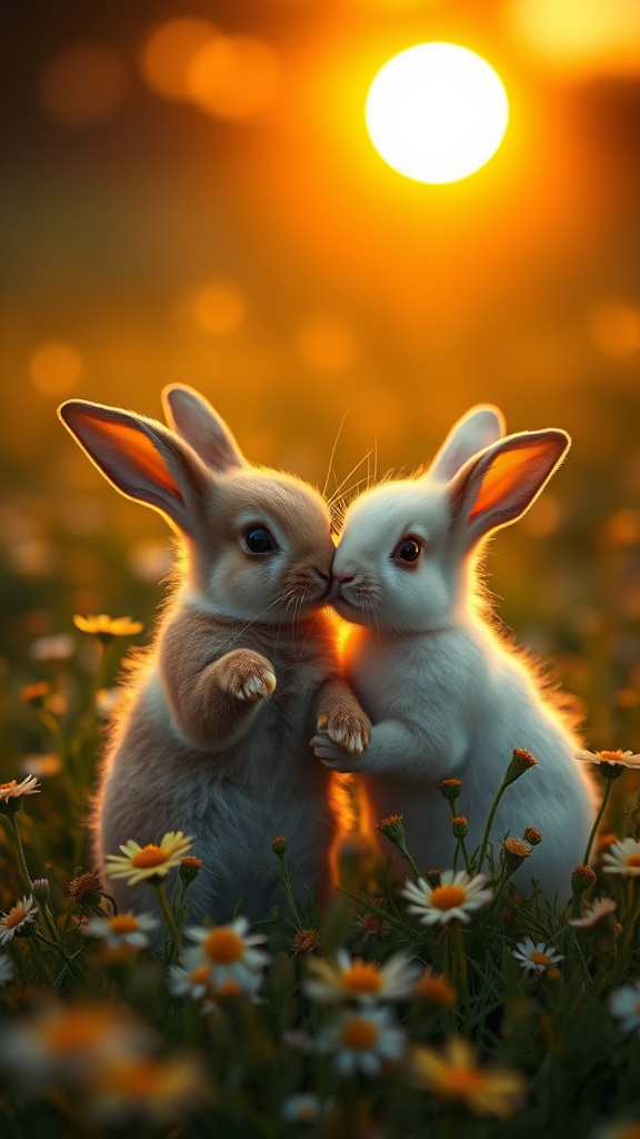 Photorealistic scene with cinematic lighting captures a tender moment between two baby rabbits, one with soft caramel fur, the other with pristine white coat, as they nuzzle affectionately under the golden rays of a setting sun, surrounded by a lush meadow dotted with wildflowers, each petal reflecting the warm glow, creating a serene and heartwarming atmosphere.