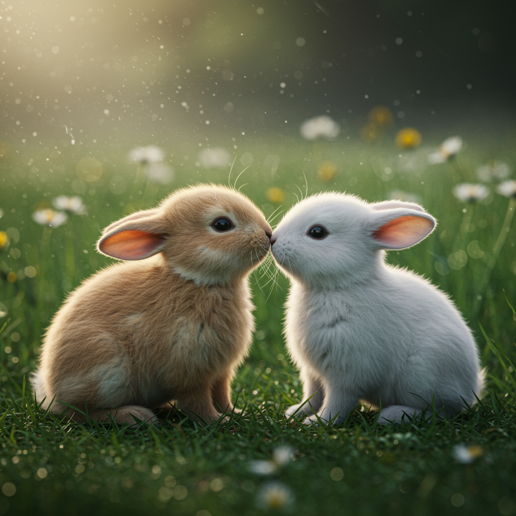 Photorealistic scene with cinematic lighting showcasing two adorable baby rabbits sharing a gentle kiss, one with soft light brown fur and the other with pristine white fur, set against a lush green meadow with delicate wildflowers in the background, capturing a moment of tender affection in stunning 32k detail with a hint of morning dew.