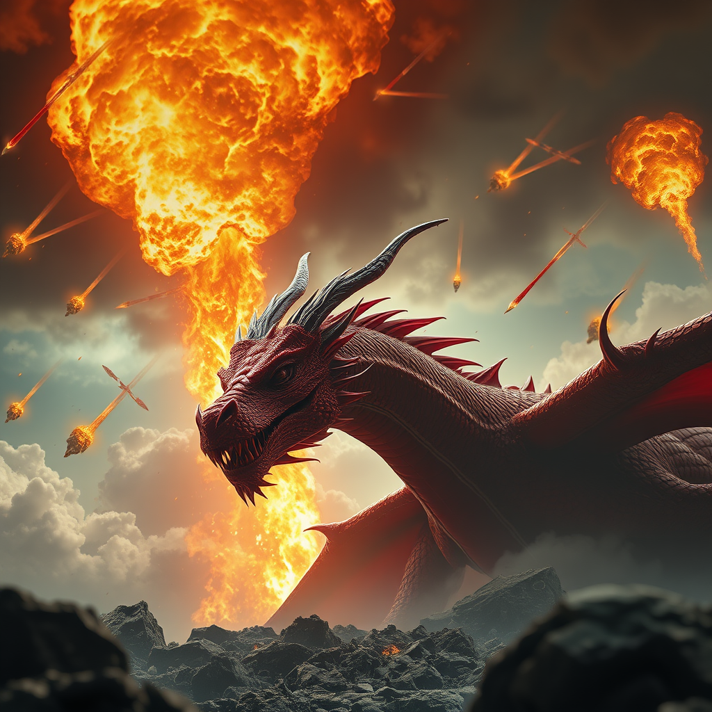 Photorealistic scene with inspiration from LOTR, depicting a catastrophic event as massive flaming meteors rain down, plunging Earth into chaos; the sky dramatically rips open from the mouth of a majestic red dragon. Despite the pandemonium, a sense of eerie calm permeates through soothing tones. This cinematic Hollywood-style scene is captured with a macro lens set at f/2.8, presenting a shallow depth of field. Elements of medieval and fantasy RPG realms intertwine, evoking a world akin to Dungeons & Dragons. Rendered in breathtaking 16K and 8K resolution, the image captures 3D details with an emphasis on comfort amidst the storm’s fury.