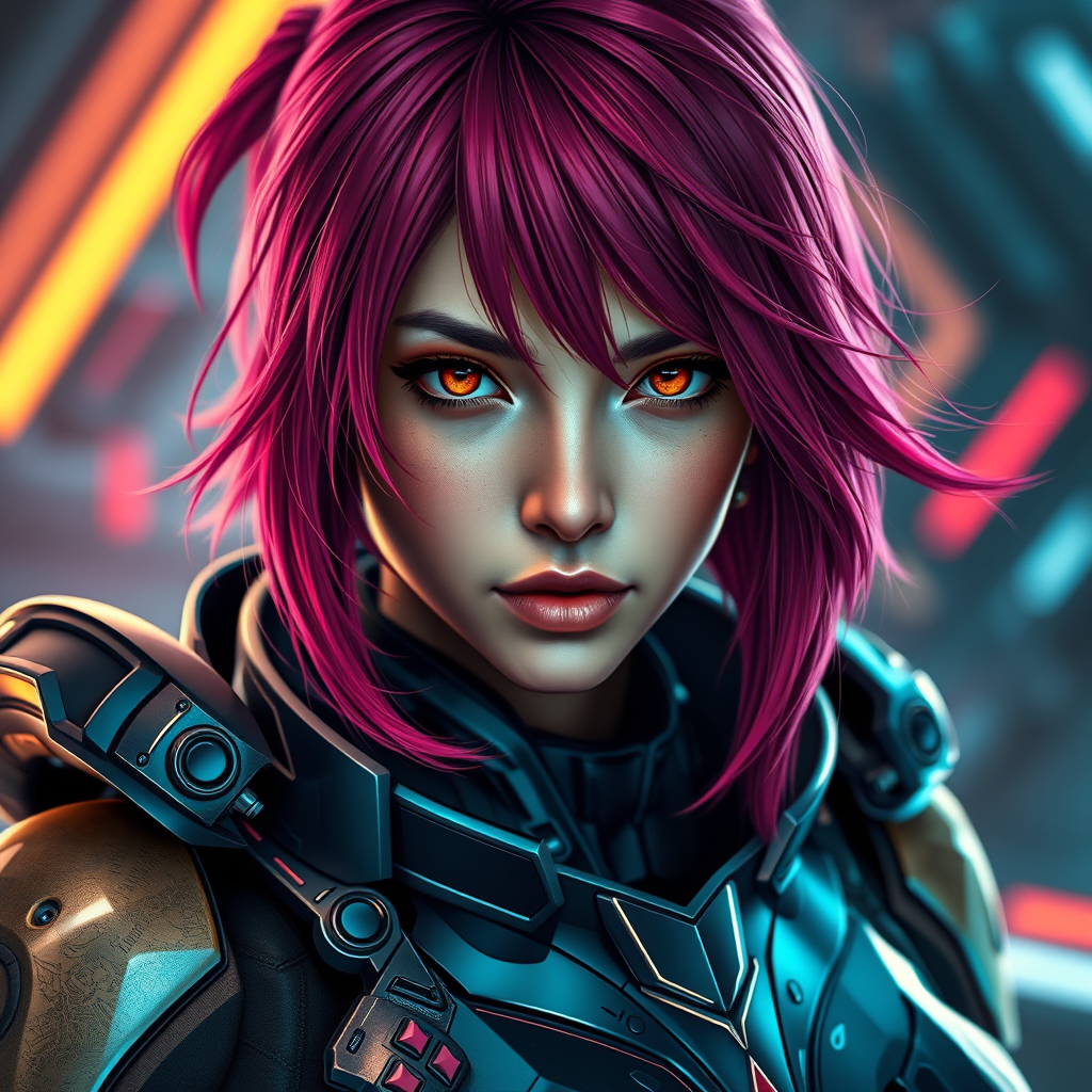 Photorealistic stunning portrait of Asuka Langley in sleek sci-fi armor, with intricate details and vivid colors, showcasing her strong and confident demeanor against a futuristic backdrop, featuring dynamic lighting and realistic textures, capturing the essence of a high-tech world in a 16:9 composition, emphasizing clarity and depth with heightened visual richness and storytelling elements.