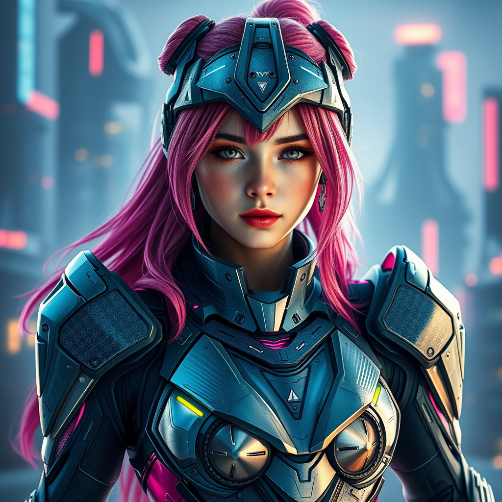 Photorealistic, stunning portrait of Asuka Langley in futuristic sci-fi armor, vibrant colors, dynamic pose, cinematic lighting, hyper-detailed background hinting at a futuristic cityscape, expression of confidence and determination, 16:9 aspect ratio, exquisite texture and shading for realistic effects, emphasis on intricate armor design, atmospheric depth and realism.