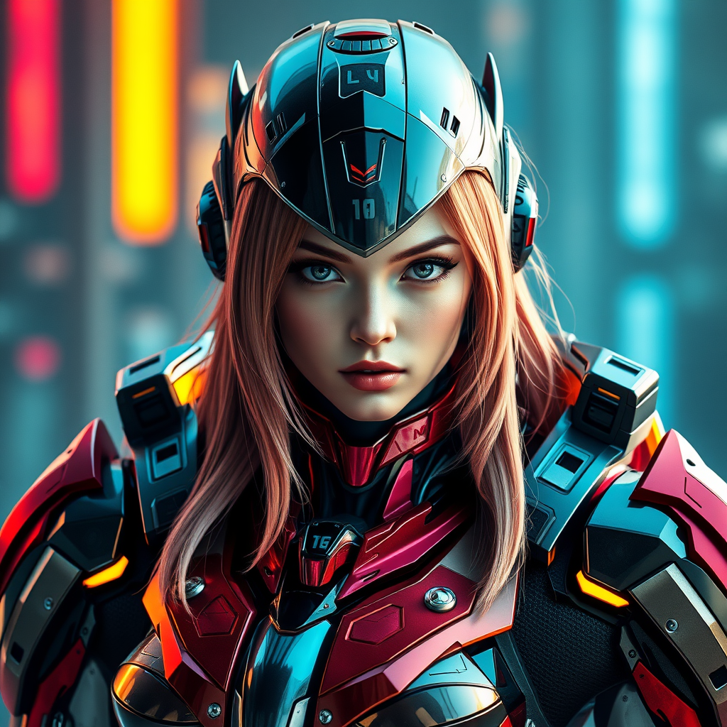 Photorealistic, stunning portrait of Asuka Langley in futuristic sci-fi armor, vivid and intricate details, sleek design with advanced technology elements, vibrant colors and captivating expression, dynamic lighting showcasing armor's reflective surfaces, emphasizing a sense of strength and elegance, high-resolution quality and artistic depth.