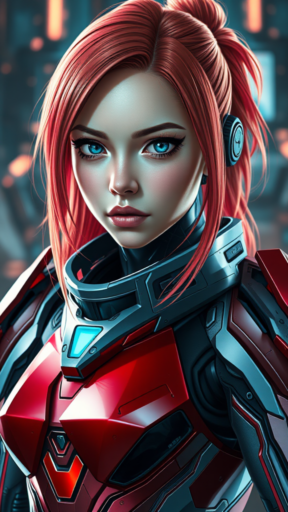 Photorealistic stunning portrait of Asuka Langley clad in sleek, futuristic sci-fi armor, capturing intricate details and vivid colors, harmonizing a blend of realism and imaginative design elements, set against a dynamic background that enhances the high-tech theme, emphasizing expressive features and a captivating gaze, dimensions in a vertical 1:2 aspect ratio, balancing complexity and clarity to create a visually striking image.
