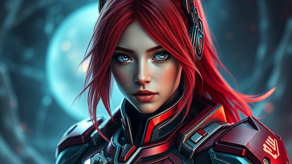 Photorealistic stunning portrait of Asuka Langley in intricate sci-fi armor, elegant and futuristic design, lifelike details, vibrant colors, impeccable texture, dramatic lighting, ethereal and immersive atmosphere, capturing emotion and strength, set against a captivating, otherworldly background, vast cinematic aspect ratio for immersive storytelling.