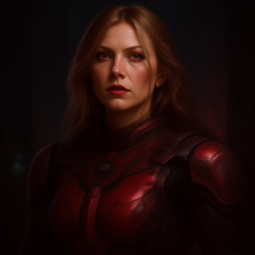 Photorealistic stunning portrait of Asuka Langley in futuristic sci-fi armor, meticulously detailed armor design, striking and intense gaze, vibrant red shades accentuating her features, dynamic lighting enhancing depth and realism, background hints of a high-tech, advanced setting, capturing a perfect blend of beauty and strength, a vision of elegance in a science fiction realm.