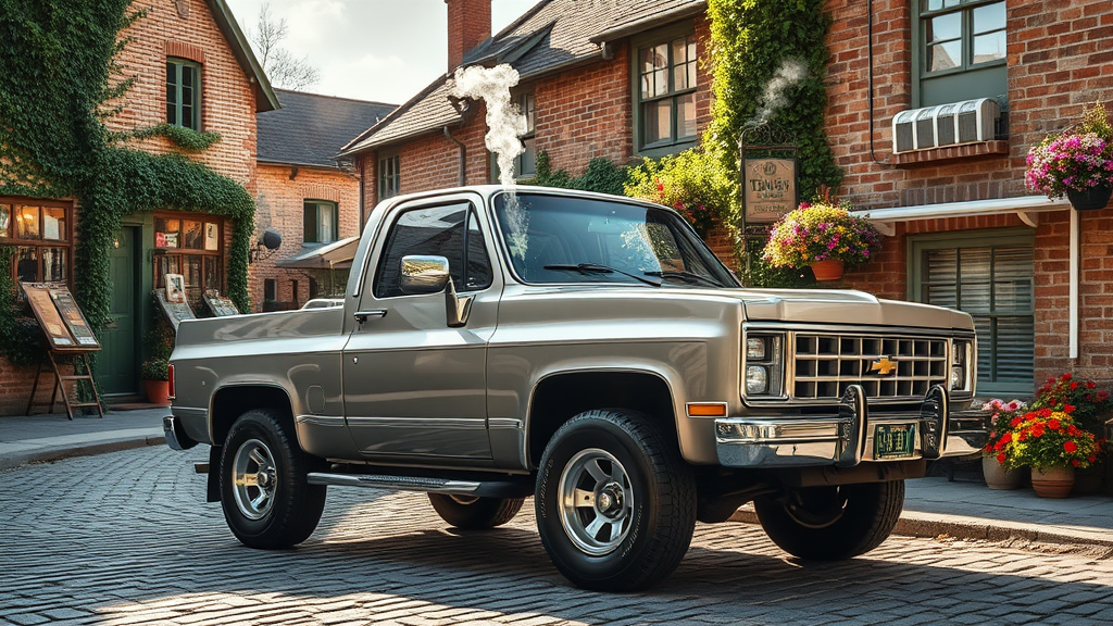 Photorealistic ultra detail of a brilliantly polished silver 1987 Chevrolet Blazer K5 parked on a cobblestone street in a quaint village under the bright noon sun. Surrounded by charming brick cottages with ivy-clad walls and blooming flower baskets, the scene captures the essence of serene rural life. The metallic surface of the SUV reflects the vibrant hues of colorful market stalls nearby, offering a cinematic 8K view that highlights the intricate details of the vehicle and its picturesque surroundings. Smoke gently rises from a rustic chimney, adding a touch of warmth to the crisp midday air.