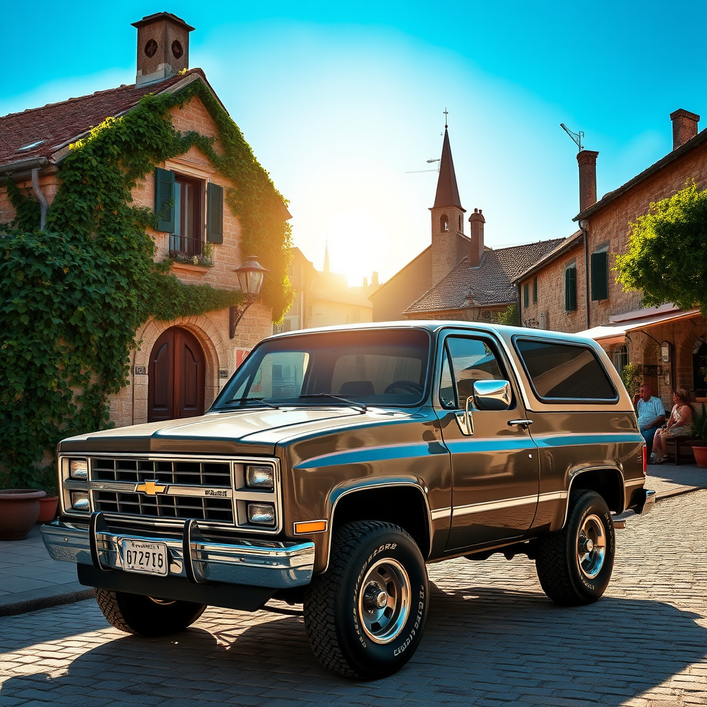 Photorealistic ultra detail of a metallic charcoal 1987 Chevrolet Blazer K5 parked in a charming village square at midday. The sun casts a warm glow, highlighting the vintage vehicle's curves and texture against the rustic backdrop of cobblestone streets and quaint houses. Lush green ivy climbs the nearby stone walls, and locals enjoy a serene afternoon under the vivid blue sky. Cinematic 8K resolution captures every intricate detail, merging nostalgia with the timeless beauty of the scene.
