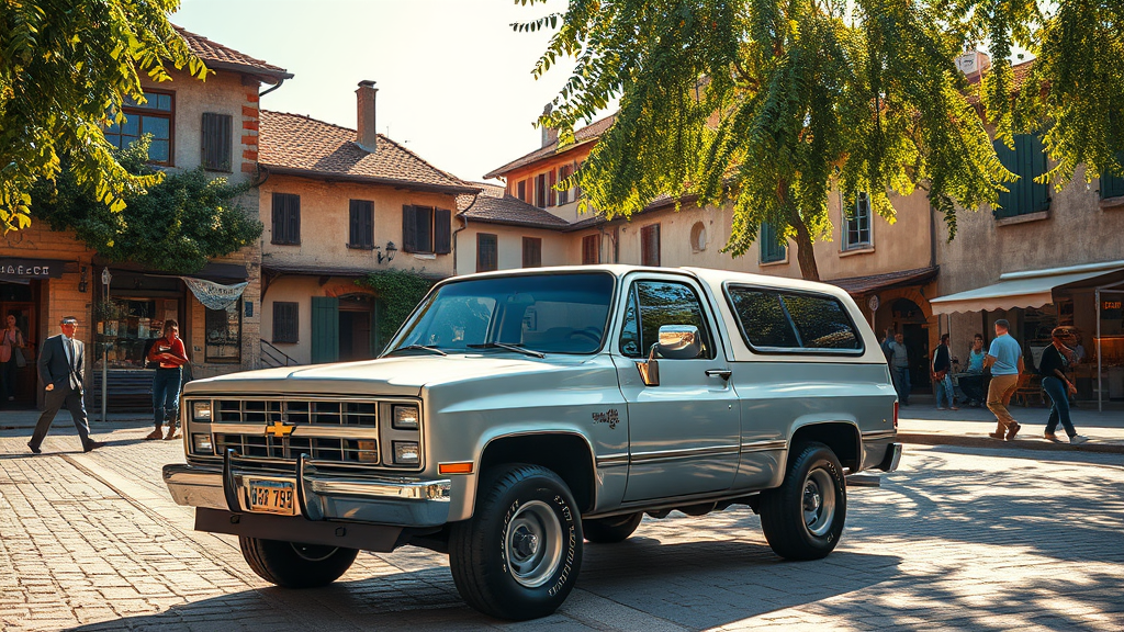 Photorealistic ultra detail scene of a classic Silver Chevrolet Blazer K5 from 1987 parked near a rustic village square under the bright midday sun, capturing the glint of sunlight on its metallic surface. The village buzzes with life, a mix of cobblestone streets and timeless architecture, with townspeople going about their day. A gentle breeze stirs the leaves of nearby trees casting dappled shadows on the vintage vehicle. The scene exudes a nostalgic yet vibrant atmosphere with cinematic 8K clarity.