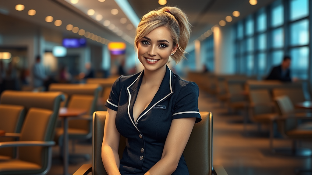 Photorealistic, ultra high resolution, cinematic lighting, ambient sidelighting, exquisite details and textures, one girl, full body, smiling, ponytail, blonde hair, engaging with the viewer, detailed facial features, seated position, modest bust, wearing a flight attendant uniform, high heels, situated in an airport lounge, intricately detailed background with depth of field effects, professional lighting, photon mapping, radiosity, physically-based rendering, artistic touch, watercolor effects, easy negatives, artistic painting elements, avoiding low resolution and low quality characteristics, skin texture with natural imperfections, subtle backlighting, aiming for realism, avoiding unnatural limb proportions or deformities, maintaining clear and focused imagery, aiming for elegance without unnecessary distractions.