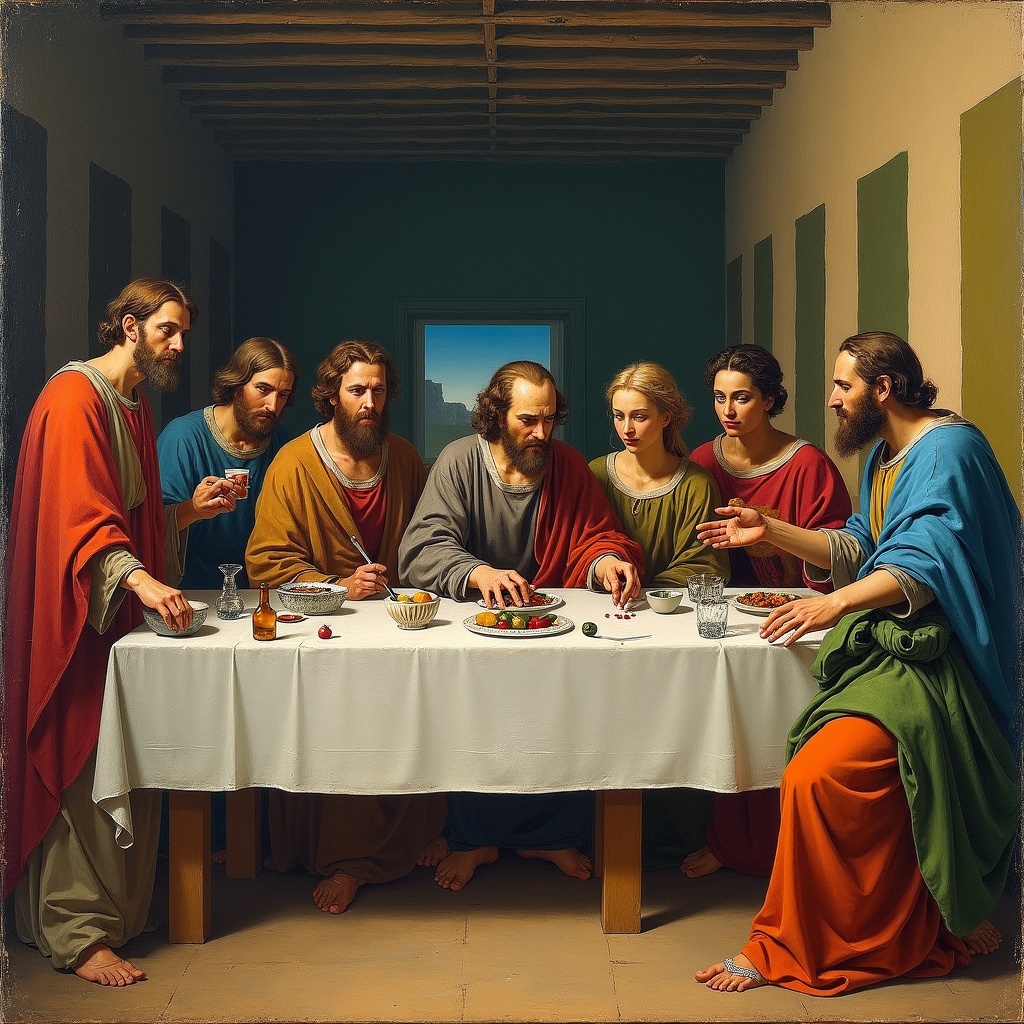 View this AI-generated image featuring picasso depicted the scene of the last supper. Created using advanced AI technology, this image showcases creative visuals, AI artwork. Perfect for creative projects, digital art, inspiration.