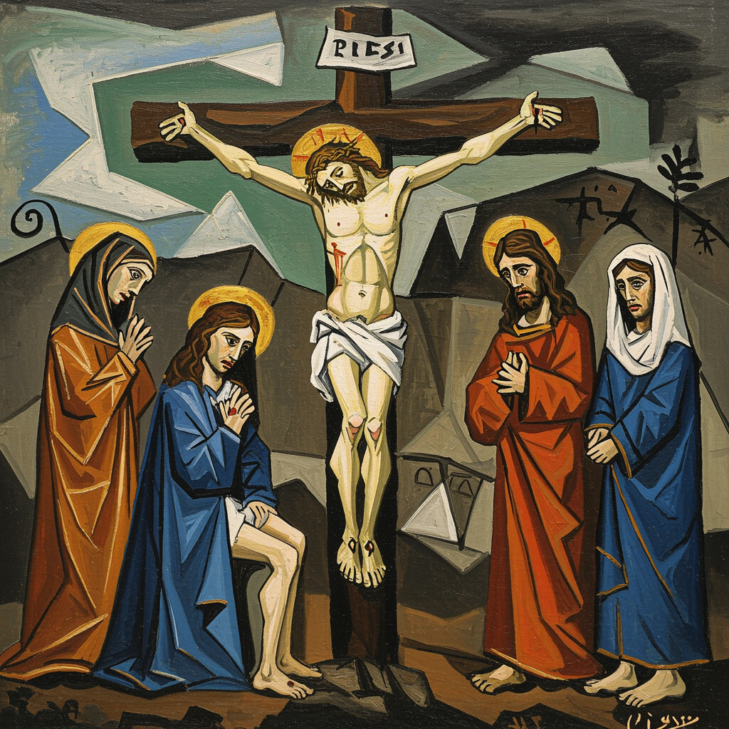Picasso depicted the crucifixion scene with abstract forms and vivid colors.