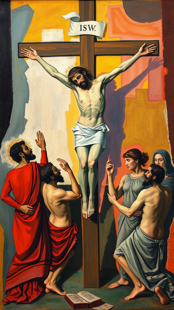 Picasso reimagined the crucifixion scene with abstract forms and vivid colors, capturing the emotional intensity and spiritual depth through distorted figures and dynamic compositions.