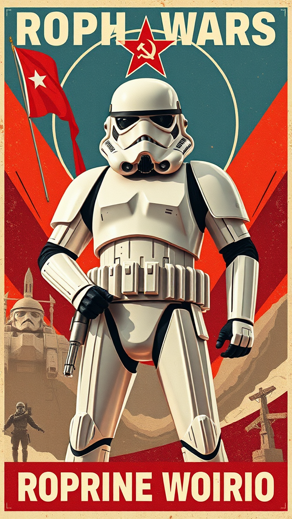 Picture a Stormtrooper prominently displayed in a recruitment poster reminiscent of Soviet Union aesthetics, with bold, vibrant colors and striking design elements. The character stands proudly in full armor, an embodiment of unity and strength, with a symbol seamlessly integrated into the composition. The backdrop features retro-style graphics and iconic imagery, complemented by inspirational slogans that convey a powerful and thought-provoking message. The overall visual is both compelling and evocative, drawing attention to its narrative of solidarity and power.