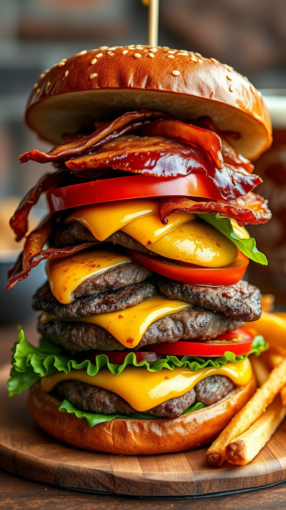 Picture the ultimate burger experience: a towering masterpiece crafted with succulent, perfectly grilled Wagyu beef, enhanced by a layer of gooey melted smoked gouda cheese and savory strips of crispy pancetta, all nestled between two soft, toasted pretzel buns. Elevate this creation with sweet balsamic-glazed onions, thick slices of heirloom tomatoes, and fresh butter lettuce, all finished with a zesty roasted red pepper aioli. Accompanied by a side of truffle parmesan fries and an ice-cold craft beer, this irresistible burger promises a symphony of flavors that will captivate your senses.