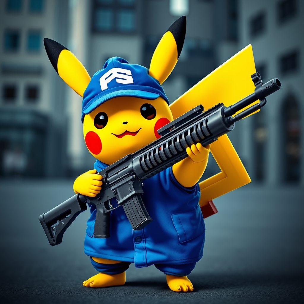 Pikachu dressed in blue gang attire, wielding a customized assault rifle, standing confidently with an urban backdrop, embodying a bold and rebellious spirit.