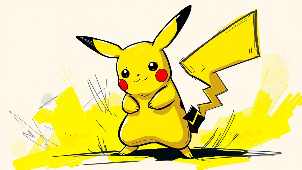 Pikachu dynamic stance, anime influence, sketch style, nvinkpunk flair, expressive brush strokes, bold lines, HDR Neo-Noir vibe, vibrant yellow neon accents, minimalistic essence.