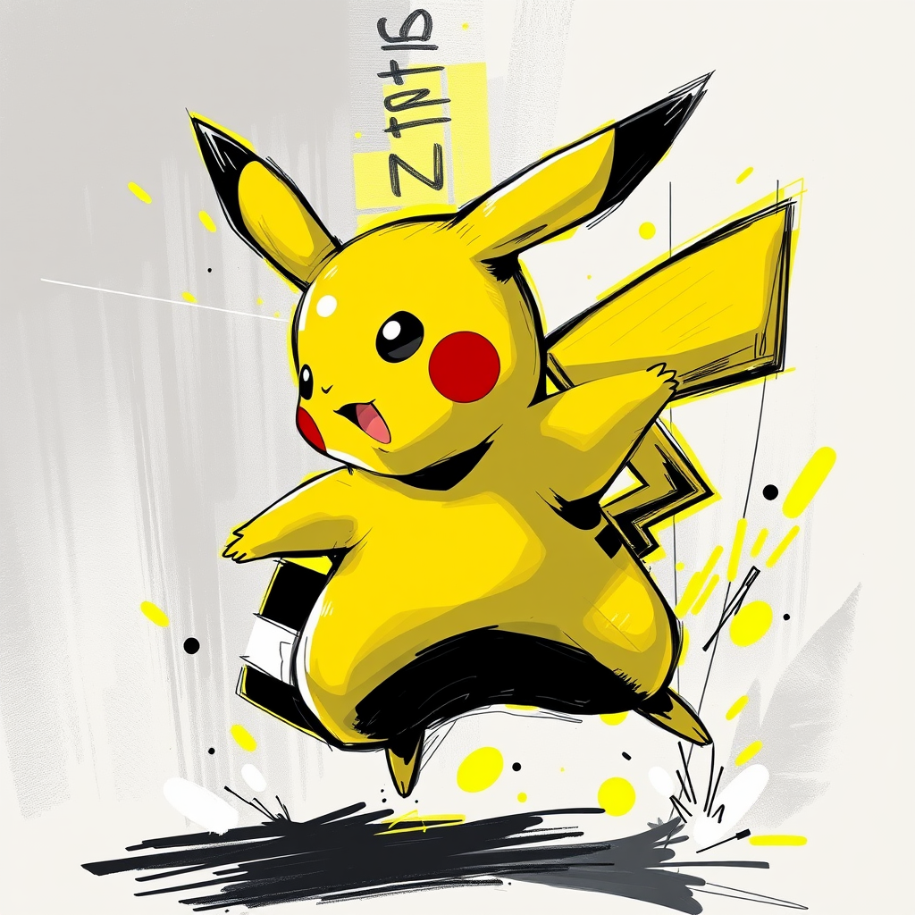 Pikachu in dynamic pose, anime sketch style, nvinkpunk influence, bold brush strokes, pronounced lines, HDR Neo-Noir vibe, vibrant neon yellow highlights, abstract elements, subtle creative twists.