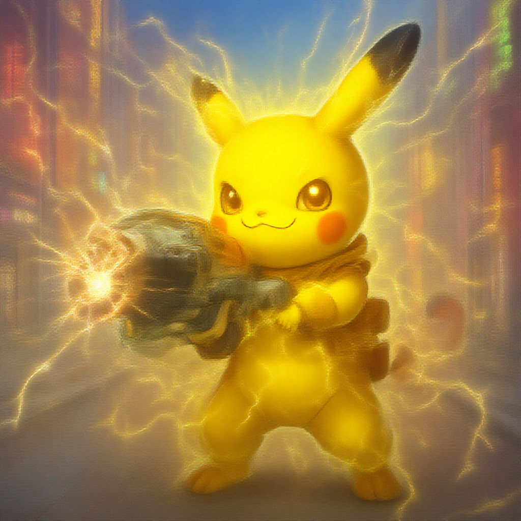 Pikachu sporting a futuristic laser blaster, electricity crackling around, as it stands ready for action in a vibrant urban setting.