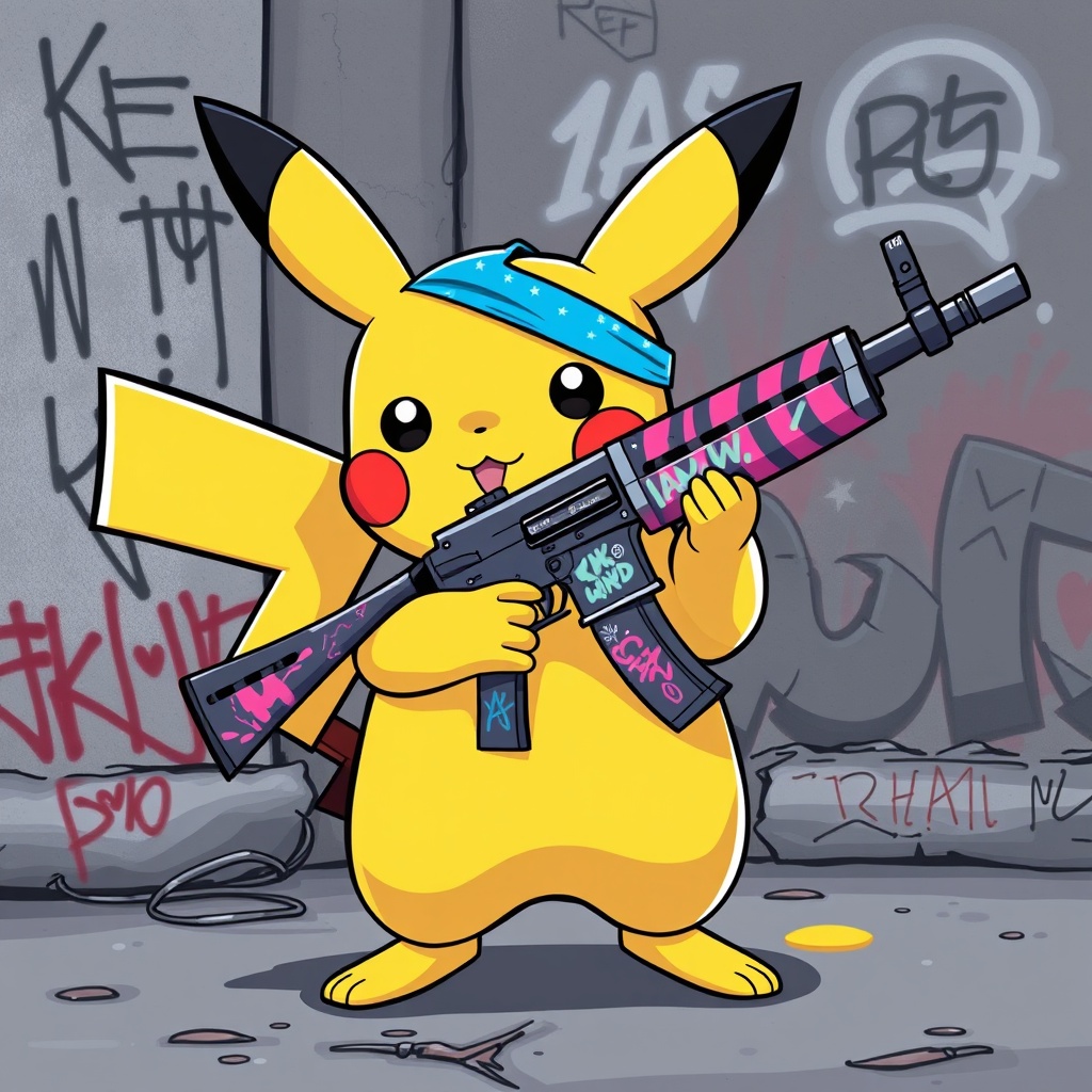 A cartoonish Pikachu standing confidently with a neon-blue bandana, holding a bright, graffiti-stylized AK-47, surrounded by urban street art with a subtle nod to electric motifs, embodying a playful yet edgy street-style persona.