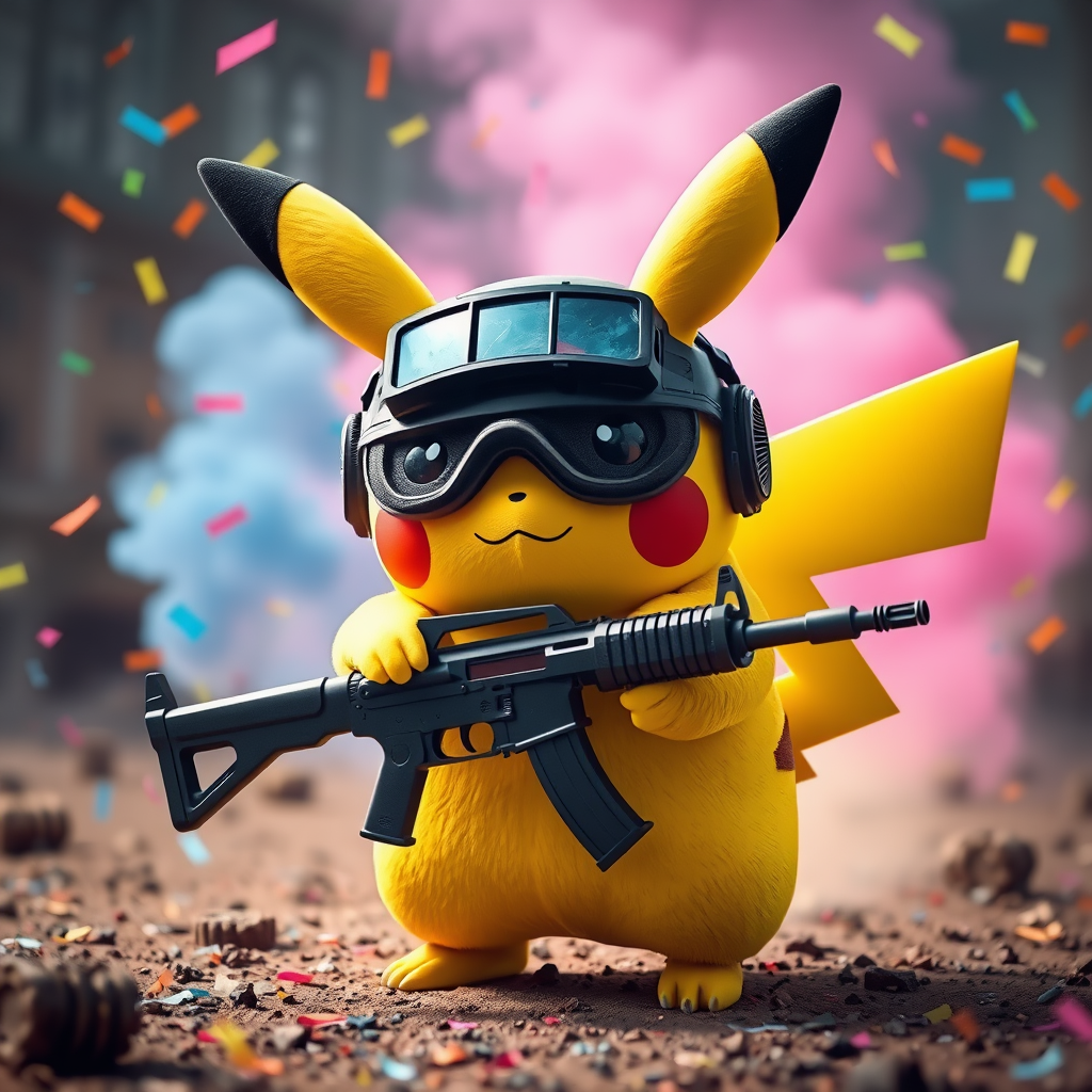 Pikachu wearing tactical gear, holding a toy blaster that resembles an AK47, stands in an action pose amidst a playful battlefield scene with colorful smoke and confetti in the background.