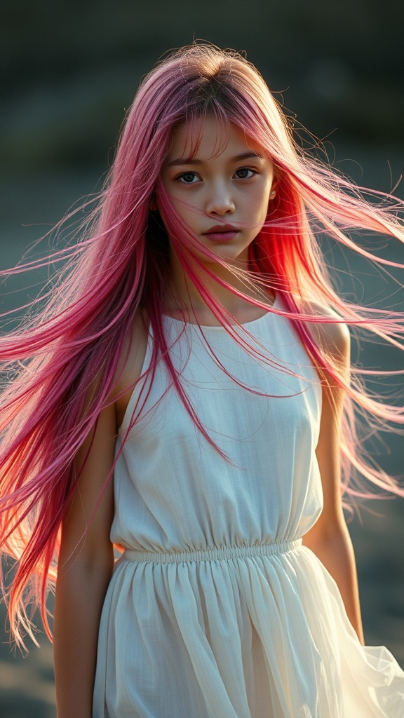 View this AI-generated image featuring a girl with long pink hair wearing a light dress stands in a strong wind captured with an 80mm lens featuring soft light and sharp details the exposure blend creates a medium shot with a bokeh effect the scene is high contrast with low saturation emphasizing a