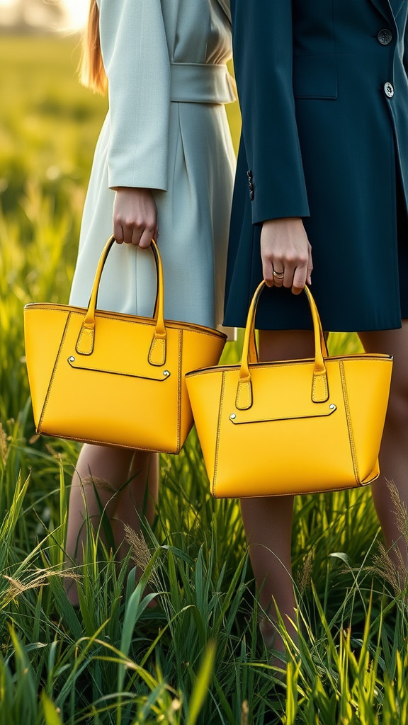 Pinterest-inspired image featuring two yellow and blue JACQUEMUS Le Chiquito bags held by models standing in a lush field of grass; captured with professional photography, the scene is bathed in soft, natural light. The bags, iconic in design, are the focal point amidst the serene environment. The image is in high resolution, photorealistic, and 8k quality, showcasing fine details that emphasize the brand's elegance and style.