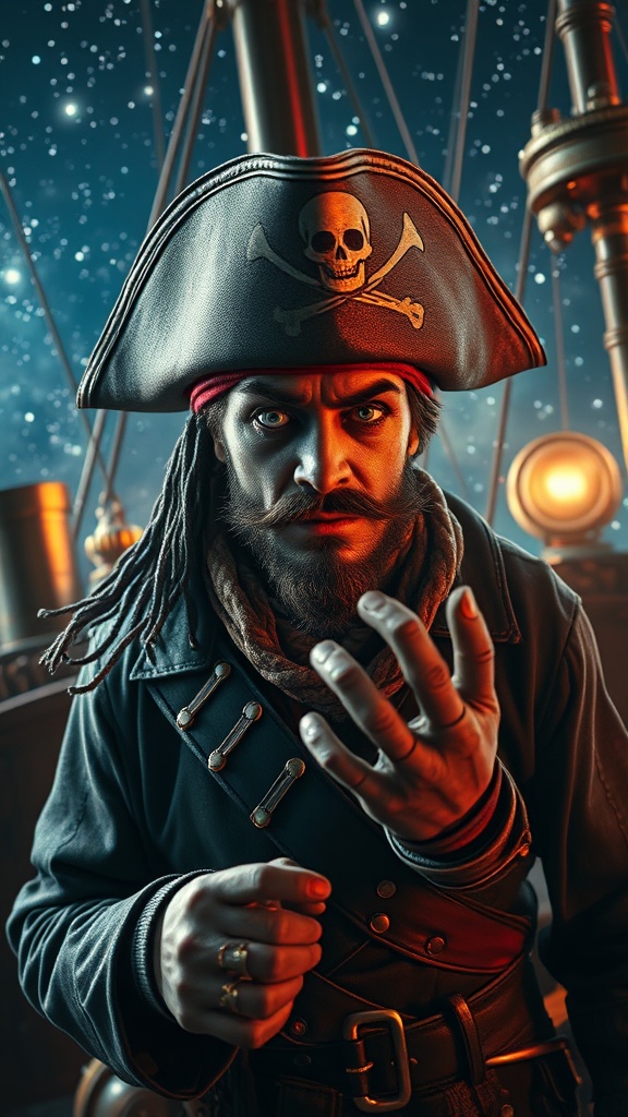 A space pirate in the style of Sam Bosma dons a Jolly Roger hat, standing aboard a steampunk ship amidst an otherworldly atmosphere. The cinematic composition unfolds under dramatic lighting, revealing the character in ultra-high detail, resplendent in 16k UHD HDR. His eyes are intriguingly quirky, with deformed irises and pupils suggesting an unearthly vision, complemented by a cross-eyed look. The atmosphere is rich with mystery as his hands appear with unique attributes, hinting at extra fingers and a hint of mutation. The scene is alive with the vibrancy of deep space adventure, free from distractions like signatures or text, achieving a striking depiction of a space-faring maverick against the backdrop of star-studded skies.