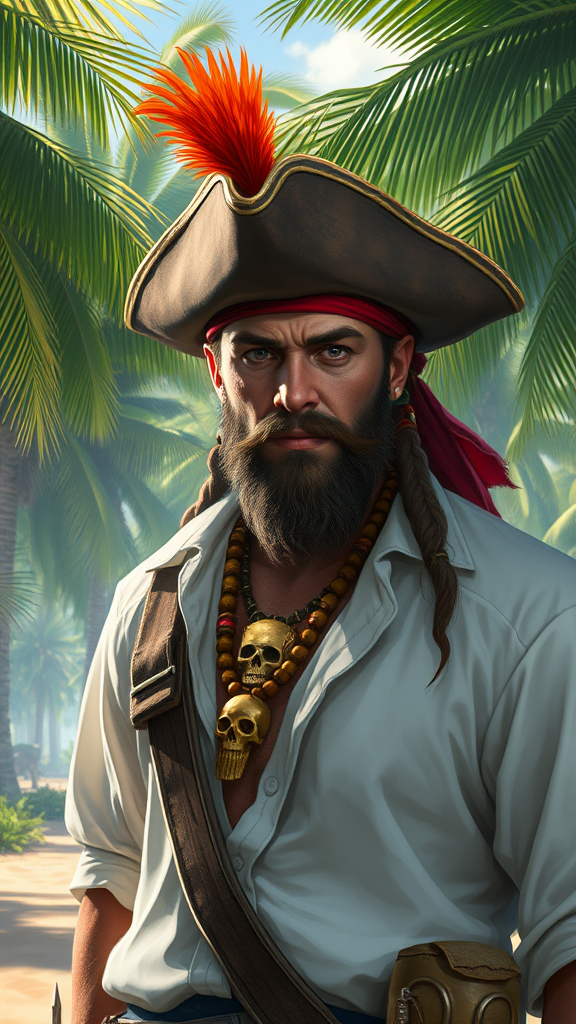 Pirate, rugged and masculine, wearing a billowy white shirt, adorned with a golden amulet featuring a skull at the neckline, crowned by a pirate hat with a vibrant feather, face richly detailed, standing amid a lush island brimming with palm trees, highly detailed digital painting, artstation-inspired concept art, matte finish with sharp focus, illustration in the style of artgerm and greg rutkowski, rendered in 8k, the scene captures the pirate's adventurous spirit with a hint of mystery, glimmers of sunlight piercing through the palm fronds, casting dynamic shadows on the sandy ground.