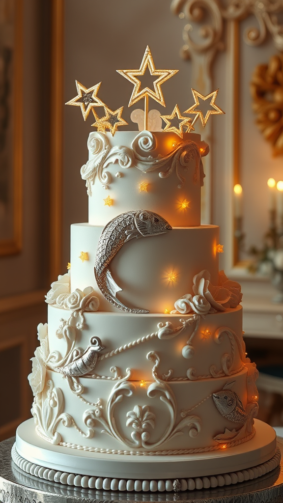 Pisces-inspired wedding cake adorned with intricate baroque decorations and bright stars, exuding elegance in a photorealistic digital art style; depicted in a three-quarter view that highlights detailed textures and ambient lighting, showcasing depth of field and subtle creative enhancements.
