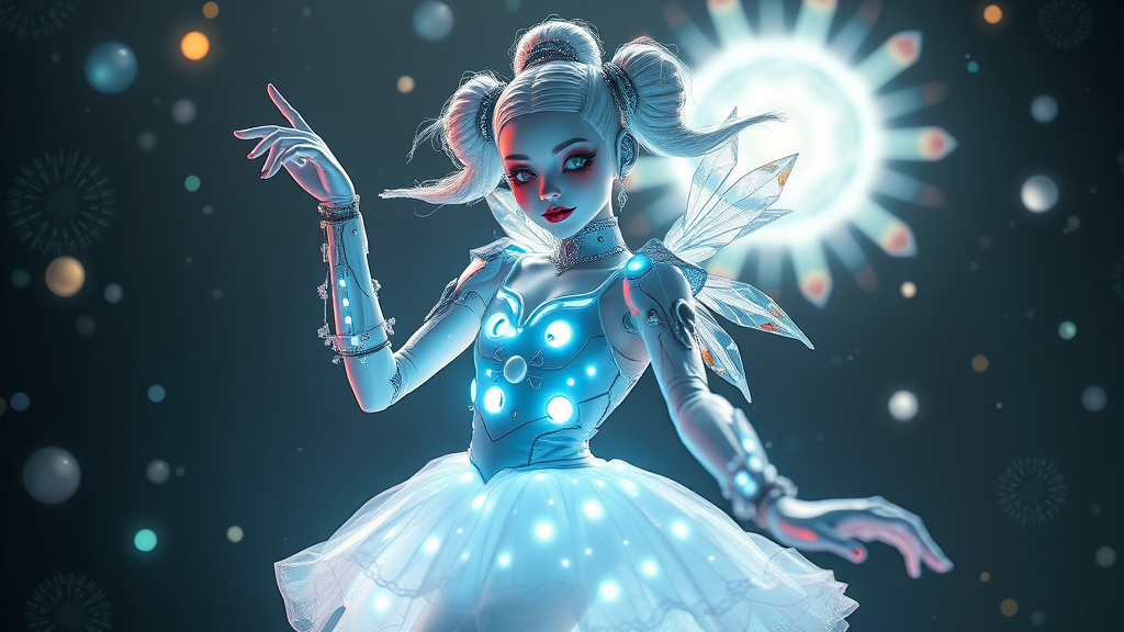 Pixar-inspired 8k photo of a stunning, luminous white galactic prima ballerina with a clowncore aesthetic, a Russian cyborg college girl featuring elements of the golden ratio. This sci-fi and fantasy character blends cyberpunk influences with intricate, decadent, and highly detailed digital painting. Capturing the spirit of Ever After High, the piece employs an octane render style akin to ArtStation concept art, characterized by smooth lines and sharp focus. Influences from artists like Artgerm, Loish, and WLOP are evident, ensuring a visually captivating illustration within a futuristic narrative.