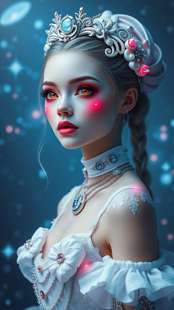 Pixar-inspired 8k portrait of a stunning futuristic white galactic prima ballerina with a hint of clowncore influence, blending Russian elegance with cyborg features. The character is a college girl with golden ratio detailing, set in a sci-fi fantasy world. The style is cyberpunk, intricate and decadent, featuring high detail in digital painting. The scene draws inspiration from Ever After High and employs octane rendering for a smooth, sharp focus. The artwork is reminiscent of creations by Artgerm, Loish, and WLOP, blending concept art finesse with lush illustration techniques. The modifications incorporate a vibrant and playful use of neon colors to emphasize the galactic theme, adding a whimsical touch to her ballerina attire.