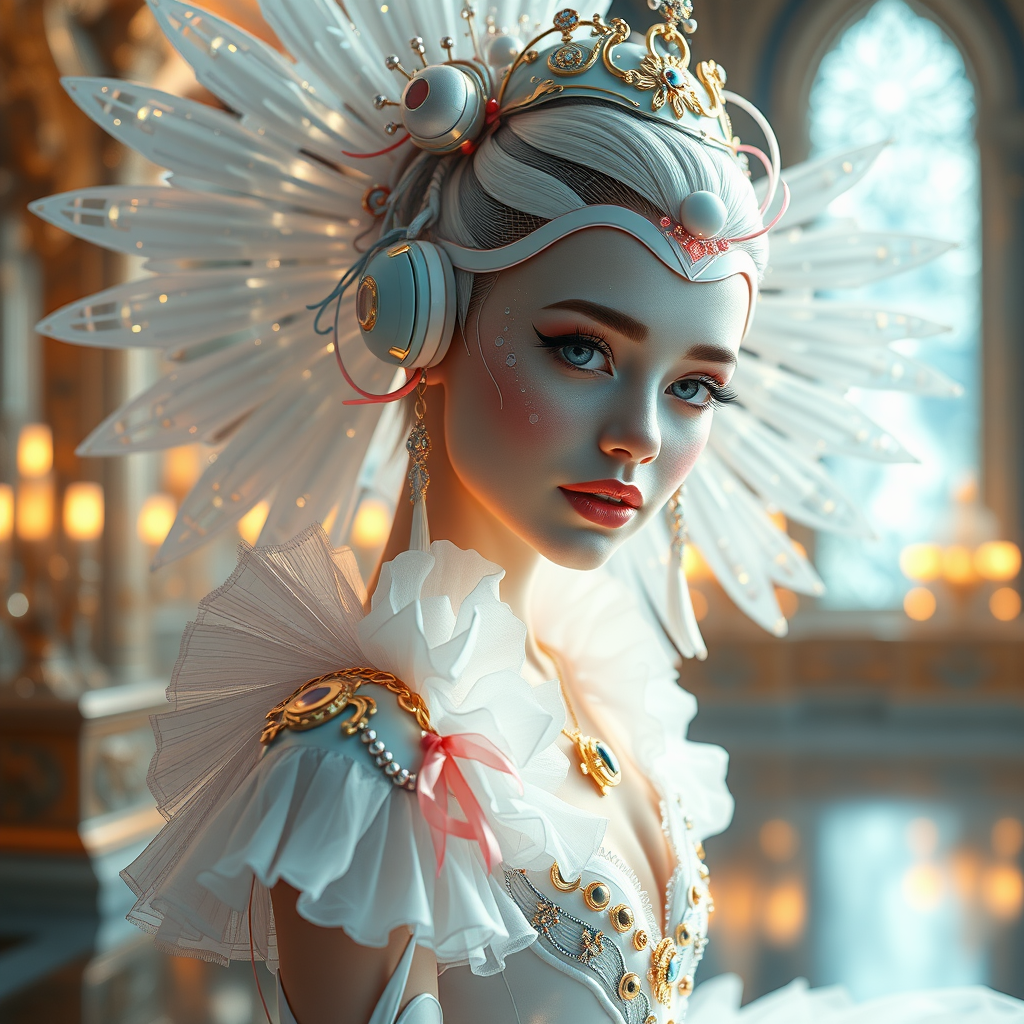 Pixar-inspired 8k portrait of an exquisite, radiant white galactic prima ballerina with elements of clowncore style, portrayed as a Russian cyborg college student. The composition boasts intricate golden ratio details, blending sci-fi and fantasy aesthetics with a cyberpunk twist. The scene is lavish and highly detailed, embodying the essence of a digital painting. It resembles the whimsical world of Ever After High, rendered in high octane, suitable for ArtStation concept art. The artwork exhibits a smooth, sharp focus typical of illustrations by Artgerm, Loish, and WLOP, enhanced by subtle creative modifications to highlight its fantastical, contemporary beauty.