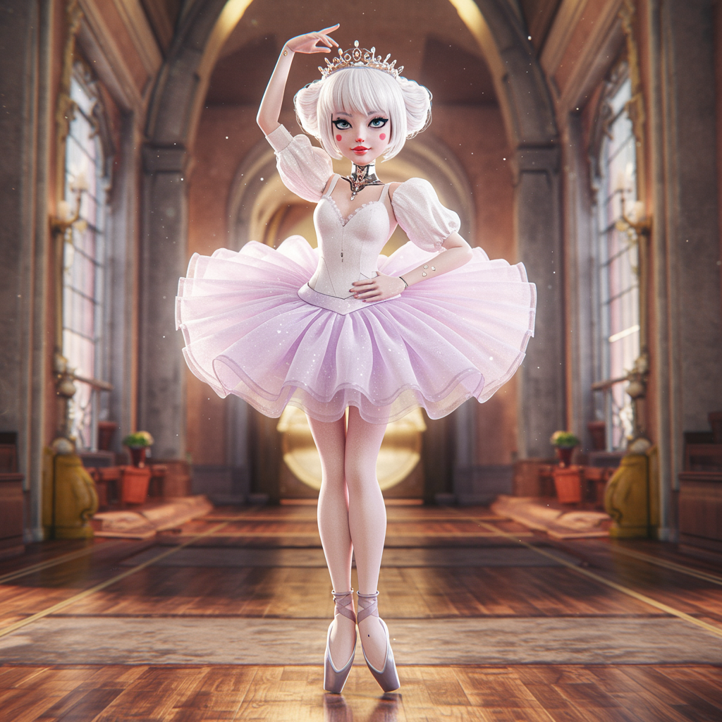 Pixar-inspired 8k portrait of an exquisite, radiant white futuristic prima ballerina with a clowncore twist, embodying a Russian cyborg college girl. Embracing the golden ratio's perfection, this scene blends sci-fi and fantasy with cyberpunk elements, showcasing intricate, lavish details. A digital painting reminiscent of Ever After High style, rendered in octane, featured on ArtStation. The concept art boasts smooth and sharp focus, an illustration reminiscent of Artgerm, Loish, and WLOP, all while maintaining a flawless execution.